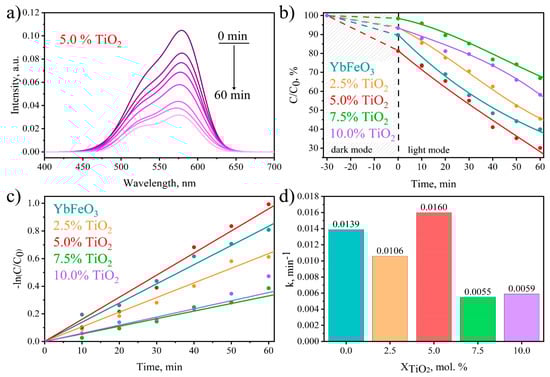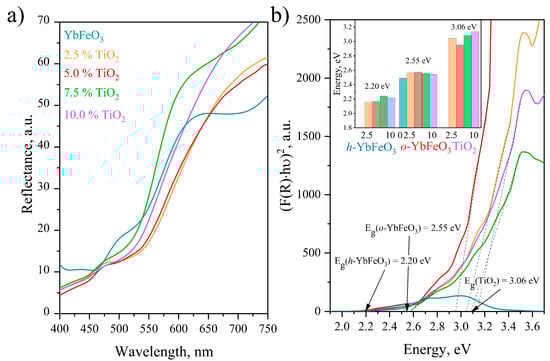 The optical absorption property of h-YbFeO3/o-YbFeO3/TiO2 was analyzed via UV-vis diffuse reflectance spectroscopy, and the results are shown in Figure 7a. The UV–visible absorption spectra of the synthesized nanocomposites were recorded in the range of wavelength of 400–750 nm. The light reflection spectra exhibit the reflection bands in the visible region, implying that those samples should be effective as visible light photocatalysts. Samples with 2.5 and 5 mol.% of TiO2 show the most intensive absorption in the visible light region, which makes them perspective for visible-light-driven photocatalytic processes.