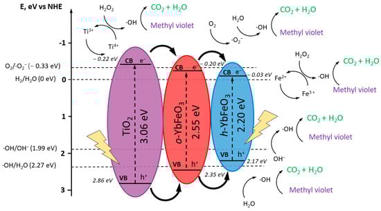 In turn, the photo-generated holes (h+) from VB TiO2 can react with water molecules (H2O) to form hydroxyl radicals (·OH) or migrate to the VB o-YbFeO3 and, finally, to h-YbFeO3 to participate in the formation of hydroxyl radicals (·OH) in the same process. Methyl violet is oxidized by ·OH to produce the two most stable products, CO2 and H2O.