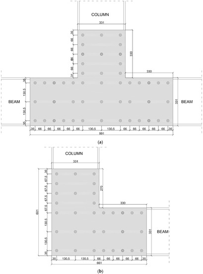 The geometry of the joints, including the size of the plates and the screw distribution, are represented in Figure 3. Joints connecting the column with a beam are labelled as L-joints, and joints connecting the column with two consecutive beams are labelled as T-joints.