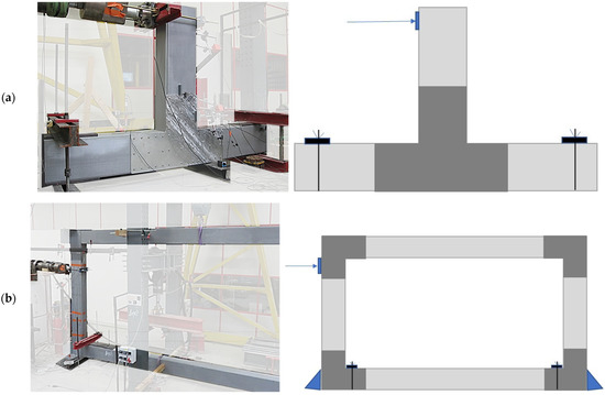 The test set-up concerning the beam-to-column elements is represented in Figure 5. The joint, as well as the pultruded element section, are reproduced in full scale. Steel T-shaped plates were symmetrically placed on both sides of the joint. The lever arm of the horizontal load, with respect to the centre of the joint (identified as the intersection between the axis of the pultruded GFRP members), was equal to 1.2 m. The two edges of the beams were equipped with steel fixation elements to prevent both horizontal and vertical displacements. In proximity to the column edge, where the horizontal load was applied, a hinge was reproduced. The lengths of the GFRP members converging in the joint were defined in order to simulate the conditions to which the connecting element is subjected within the actual frame.