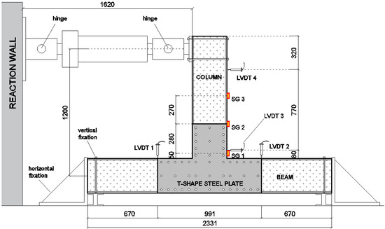 Test set-up of beam-to-column element (specimens T1 and T2_W) (measures in mm).