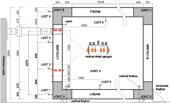 The test was carried out in displacement control with a stroke rate of 2.2 mm/s. Along the L-column, at different heights, LVDT were placed (LVDT 1, LVDT 2, LVDT 3, LVDT 4) to record the horizontal displacement distribution of the member during the test. In addition, a laser sensor was placed to record the horizontal displacement of the column in proximity to the load application point. Strain gauges sensors were applied over the web of the L-column, in correspondence with two different heights, to have the flexural deformation of the pultruded element (six strain gauges at each height). Four strain gauges were placed at the external flange of the L-column. Two LVDTs (LVDT 5 and LVDT 6) were respectively placed in correspondence with the L-beam and the T-beam to monitor the vertical displacement of the members during the test. The position of each measurement device is reported in detail in Figure 6.