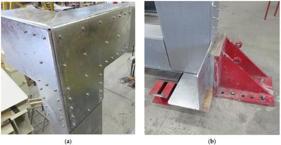 No connecting elements were placed on the inner side, and the contribution of the transversal frames was neglected. Figure 7 represents a close-up of both the external and the inner sides of the connection system at the intersection between a beam and a column of the portal frame. The frame had a length of 6.6 m and a height of 3.2 m. The frame is simply supported in proximity to the lower joints (joint A and joint D). The vertical displacement of the lower beam in proximity to the joints was prevented by fixation elements, as well as the horizontal displacement in correspondence with joint D. In the service configuration, the lateral displacement of the beam’s out-of-frame plane is prevented by the slabs of the deck. In order to reproduce this condition, wood elements were transversally placed at the mid-span of the lower beam to avoid lateral transversal buckling phenomena.