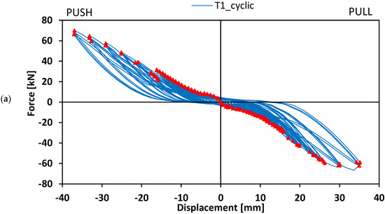 Figure 8 shows the hysteresis load–displacement curves concerning beam-to-column elements T1 and T2_W tested in cyclic loading conditions.