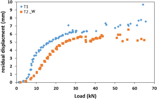 During the loading phase, the system exhibited both elastic and sliding deformation. Due to local damaged deformation, the stiffness in the unloading phase resulted lower. In fact, due to this sliding phenomenon, the energy conferred to the system in the loading phase was partially dissipated in the unloading phase. As consequence, after a complete unloading phase, the system exhibited a residual displacement. Figure 9 shows the residual displacement as a function of the applied load achieved in the different cycles, for both specimens T1 and T2_W. The curves show three phases: the first phase is characterised by small displacement, the second phase is characterised by a significant increase in the displacements, and the third phase is characterised by a quasi-constant displacement value. This representation confirmed that up to a load value of about 6 kN, in the first phase, the system exhibited an elastic response, without significant residual displacements. For higher load values, the loss of frictional capacity due to a slippage between the steel plate and GFRP members resulted in a logarithmic increase of the residual displacement up to a load value of about 30 kN. For higher load values, in the third phase, the residual displacement was roughly constant and included in the range between 5 mm and 7 mm. It can be noticed, in the second phase, that being equal to the load value, specimen T1 is characterised by higher values of the residual displacement with respect to the T2_W specimen, and it increases with the load following a less steep trend. This result emphasises that the sudden increase of residual displacement after the achievement of the frictional strength, is delayed by the presence of the washers. For specimen T2_W, the small decrease in displacement (−0.5 mm) after the load of 50 kN should not be considered, this is certainly due to the small displacement in the testing device. This result strengthened the mechanical behaviour and make it comparable to timber connection systems with a first increase in sliding and then a stabilization.