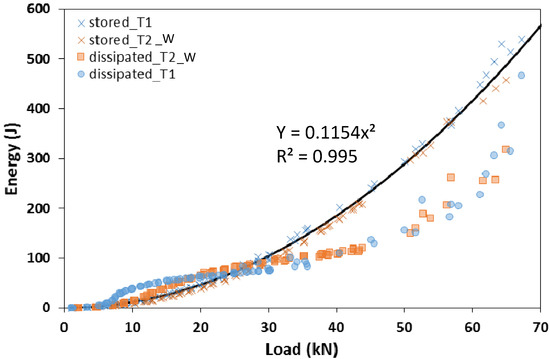 Stored and dissipated energy as a function of the maximum load for each cycle concerning T1 and T2_W specimens.
