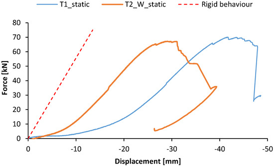 Load–displacement response of T1 and T2_W specimens tested in static loading conditions.