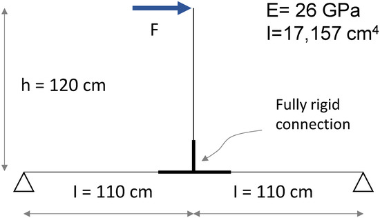 The experimental response was compared to a simplified numerical model reproducing the test conditions and assuming the joint with a rigid behaviour. The structural scheme adopted for the mechanical analysis is represented in Figure 12, including geometric details and the rigidity adopted. A usual beam model is used to get a force–displacement response. For both column and beam members, the moment of inertia was assessed with respect to the cross-section presented in Figure 2, and the Young’s modulus was assumed as the tensile module of elasticity in the longitudinal direction (Table 3). A monotonic increase in the load was simulated and the corresponding horizontal displacement at the head of the column was considered output data. All the calculations are performed with an elastic linear hypothesis of materials and boundary conditions. The load–displacement response deriving from the numerical analysis is represented as well in Figure 11. The resulting behaviour may be considered the theoretical behaviour of the connection, in linear conditions, and with a rigid joint. The aim of this is in a first approach to identify the boundary conditions of the connection. Further deeper mechanical modelling could be performed to include the slipping effect of the connection which is not the aim at this stage but FEM or non-linear analysis may be performed [35,36]. The numerical curve showed a slope higher than that one exhibited by the experimental ones. This aspect emphasised that the interaction between the connecting elements, i.e., rotation of the screws and slipping between steel plate and GFRP members, led to an overall response in which the beam-to-column connection behaves as a semi-rigid joint.