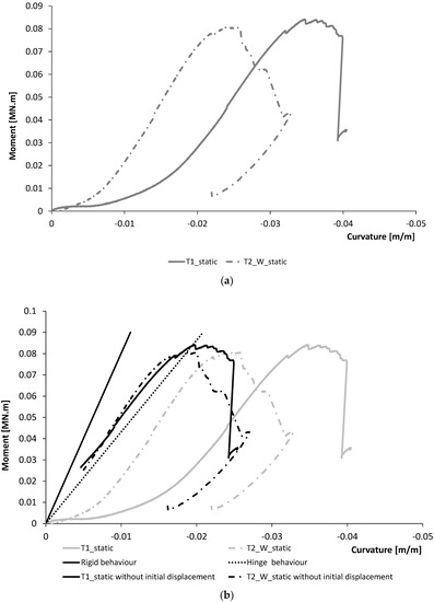 According to EN 1993-1-8:2005 [32], the limit is given if the flexural stiffness is lower than 0.5 EI/L (hinge behaviour Figure 13). According to this classification, the connection system studied is classified as a joint with a semi-rigid rotational behaviour even if the behaviour is nearby to be a hinges behaviour. This aspect is in line with what is observed in Figure 11 where the specimens T1 and T2_W show an experimental load–displacement response with a lower stiffness with respect to the numerical behaviour assessed by assuming a rigid rotational behaviour for the joint.