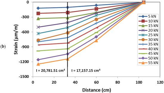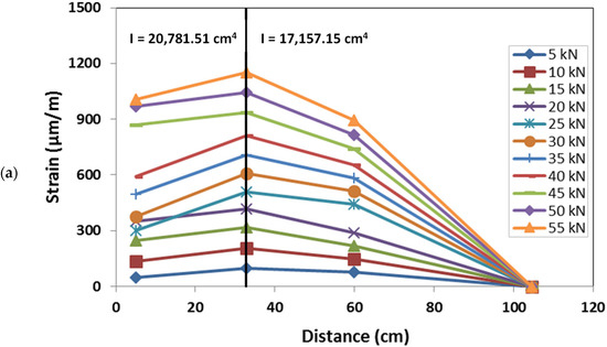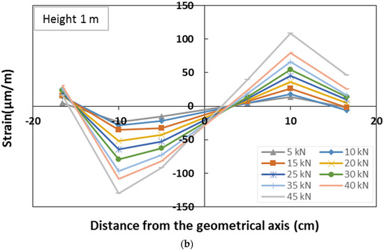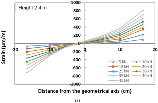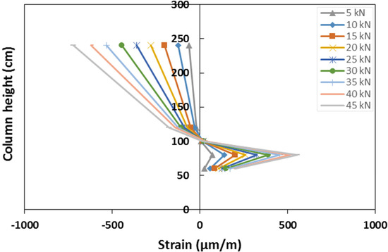 The GFRP column cross-section strain distribution was assessed at two different heights, 1 m and 2.4 m, by means of six strain gauges placed on the lateral web of each section (Figure 6). For each section, the strain gauges, placed on the same horizontal line, record the axial deformation in the vertical direction. The strain distribution of the two monitored sections, corresponding to representative values of the load during the test, is represented in Figure 18, respectively, for the sections placed at a height of 2.4 m and 1 m.
