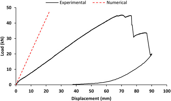 The mechanical response of the GFRP frame subjected to a monotonic in-plane lateral load is expressed in terms of the load–displacement curve. The load represents the value of the charge applied on the left column; the displacement is the value recorded by the Laser (Figure 6). The response deriving from the experimental analysis is represented in Figure 15. The response was characterised by a pseudo-linear behaviour up to the achievement of the maximum load, equal to 45.3 kN, then a plastic behaviour was in correspondence to the failure.