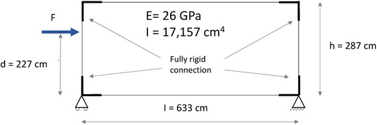 A simplified numerical model reproducing the conditions of the experimental test was implemented to describe the mechanical behaviour of the GFRP portal frame. Figure 16 shows the structural scheme adopted for the modelling.