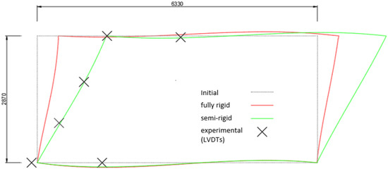 The distribution of the displacement deriving from the numerical model with fully rigid joints is represented in Figure 17. Specifically, it represents the deformed shape concerning a lateral load of 45 kN. The experimental values of the displacement in correspondence with the LVDTs placed on the structure are shown as well. The comparison shows the significant discrepancy between the fully rigid model and the actual behaviour of the portal frame.