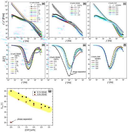 | CNF (wt.%) | DDAB (wt.%) | (°) | (Hz) | | | (°) | |ε*|·106 (F/m) | |σ*|·10−3 (S/m) | |z*| (Ohm) |