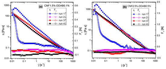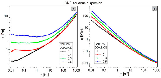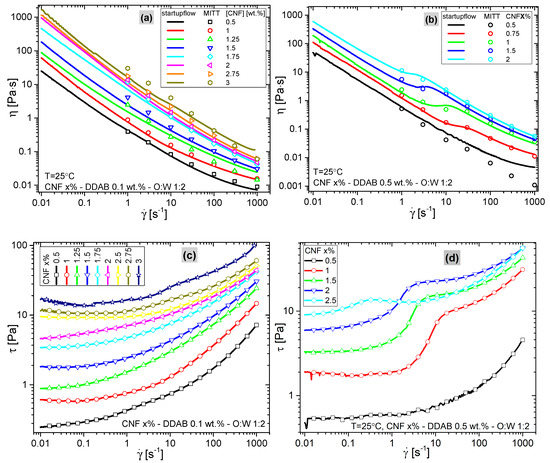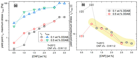 - The yield stress was determined using a yield-stress modified Carreau–Yasuda model [64]where denotes the characteristic shear rate, a denotes the sharpness of the transition in a regular viscosity function, n denotes the slope of the viscosity function at a high shear rate (n = 0→dlogη/dlog = −1), and denotes the yield stress. As the contribution of dominates the viscosity function at low , the other parameters were not evaluated, owing to their high dependence on each other. For the 0.5% DDAB sample series with the kink in the data, the fitted yield stress values were checked with extreme care and found within the range that one would determine manually from visually extrapolating the data towards = 0.