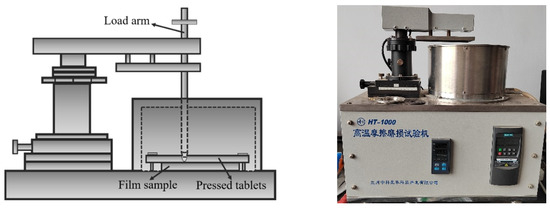 A ball on disc tribometer used for wear and friction tests was used to evaluate the friction and wear characteristics of the composite coating samples and ceramic balls at room temperature (HT-1000, Lanzhou Zhongke Kaihua Technology Development Co., Ltd. Nanchang Road, Chengguan District, Lanzhou, China). A ball on disc tribometer used for wear and friction tests is shown in Figure 1. Ceramic balls (φ5 mm) were pressed against the sample surface during sliding with a constant load of 2 N. The relative rotation of the sample and the ceramic was maintained at 100 rpm until the film on the sample surface failed. The microhardness (H) and Young’s modulus (E) of the sample film were tested by applying a load of 50 mn to the single crystal silicon wafer using a nanoindentation ZDT075-075 (Liansheng Technology Co., Ltd. Xiaolan Economic Development Zone, Jinsha Third Road, Nanchang, China) equipped with a diamond indenter. The nanoindentation depth should be less than 10% of the coating thickness. Scanning electron microscopy (SEM, Zeiss Sigma 300. Jena, Germany) was used to analyze the surface morphology and abrasion marks on the sample surface before and after the friction test, and to obtain an approximation of the film deposition thickness from the cross-sectional morphology of the coatings. Determination of film composition by energy spectrum of the sample surface was obtained by an energy dispersive spectrometer (Smart EDX). The surface morphology of the sample was obtained using an atomic force microscope (AFM, Bruker Dimension Icon, Ettlingen, Germany). At the same time, the surface roughness (Ra) and root mean square (RMS) of the samples were obtained.