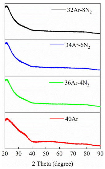 The XRD patterns of Ta2O5 coatings deposited under different flow rates of N2 and Ar are shown in Figure 2. XRD was used to analyze the phase structure of Ta metal composite coating deposited on the glass base substrate. It can be seen from Figure 2 that the coatings are amorphous when the sputtering gas conditions are 40Ar, 36Ar–4N2, 34Ar–6N2, and 32Ar–8N2, respectively. Because a large number of Ta atoms are released from the target, they are freely mixed with argon ion radicals and nitrogen ions in the chamber. One part of the Ta atom recombines with the oxygen atom to form a tantalum metal oxide, and the other part combines with the nitrogen atom to form a tantalum metal nitride. As a result, the dynamic energy of the Ta metal particles reaching the substrate is reduced, and the crystal structure cannot be formed by orderly arranging of the particle positions.