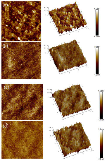Since the change in the N2 flow rate will affect the microstructure of the sample coating, the surface roughness of the sample was characterized by atomic force microscopy (AFM). The 2D and 3D morphology of the coatings’ surface roughness is shown in Figure 3. The scanning area is 3 μm × 3 μm. The coatings were prepared under pure argon sputtering conditions as shown in Figure 3a. The sputtered particles accumulate into a pyramid shape on the coatings’ surface, and there are broad peaks. The coatings prepared under mixed gas sputtering conditions are shown in Figure 3b–d. The sputtered particles on the surface of the coatings accumulate into the columnar structure. The peak decreases with the increase in the N2 flow rate. The maximum peaks on the surface of each coating are 6.7 nm, 2.0 nm, 1.7 nm, and 1.5 nm, respectively.