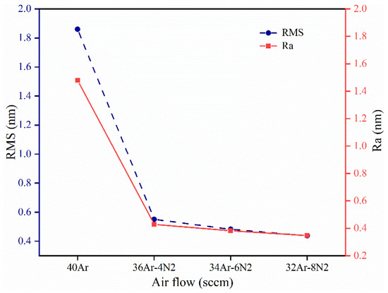 The roughness of coating samples prepared under different sputtering gas conditions was measured. The average roughness (Ra) and the root mean square (RMS) of the coatings’ surfaces are shown in Table 1 and Figure 4. The average roughness of the coating samples is nanoscale, indicating that the coatings’ surfaces are smooth. The mean values of Ra and RMS of the coating samples prepared under pure argon sputtering conditions are much larger than those of the coating samples prepared under mixed gas sputtering conditions. After N2 was introduced, the Ra value and RMS value of the coating surface decreased with the increase in the N2 flow rate.