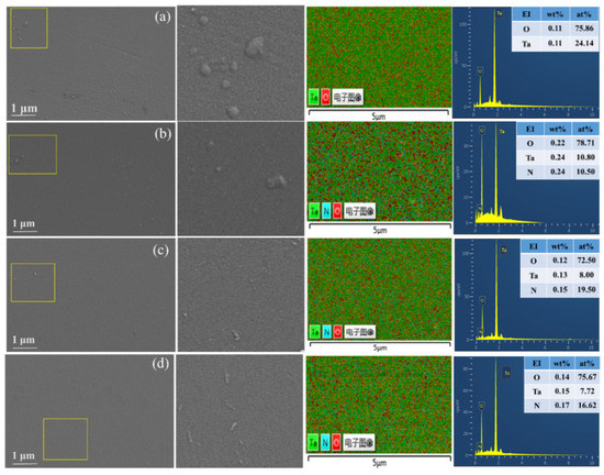 The average concentration and distribution of elements in the coating samples were obtained by EDS, as shown in the table and energy spectrum in Figure 5a–d. The table in Figure 5a shows no nitrogen atoms in the coatings. The table in Figure 5b–d shows a gradual increase in the content of nitrogen atoms, consistent with changing sputtering gas conditions during preparation. The EDS spectrum showed that Ta, O, and N elements were evenly distributed in the coatings.