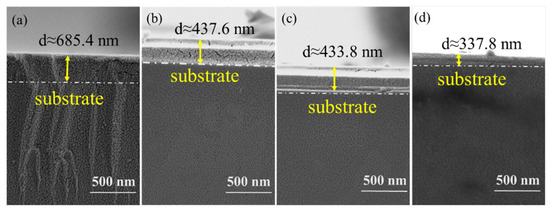 In order to observe the surface morphology and element distribution of the coating sample after N2 was introduced, the SEM and EDS spectra of the Ta2O5 coating prepared under different sputtering gas conditions are shown in Figure 5. Figure 5a shows that there is a large area of the convex part formed by the accumulation of sputtered particles on the surface of the coating, and the size of the convex part is larger. Figure 5b–d show that only a few bulges were formed by the accumulation of sputtered particles on the coating surface. The changing trend of the surface morphology and roughness of the coatings are basically consistent with those of Figure 3 and Figure 4 and Table 1. The AFM and SEM surface morphology analysis of the coatings shows that the passage of N2 can change the sputtered particles’ stacking structure and optimize the surface quality of the coatings. The deposition thickness of the coatings was 685.4 nm, 437.6 nm, 433.8 nm, and 337.8 nm after SEM scanning of the cross-section of the coatings when the sputtering gas flow rate was 40Ar, 36Ar–4N2, 34Ar–6N2, and 32Ar–8N2. Cross-sectional SEM images of the Ta2O5 coatings prepared under different sputtering gases are shown in Figure 6.