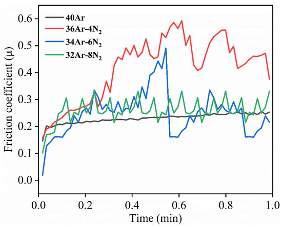 The friction coefficient curves of the Ta2O5 coatings prepared under different sputtering gases are shown in Figure 7. The fluctuation of the friction curve of the coatings prepared at a sputtering gas flow rate of 40Ar is the smallest. The fluctuation range of the friction coefficient curve of the coating samples is the largest when the sputtering gas flow rate is 36Ar–4N2. The fluctuations of the friction curves of the coating samples prepared at sputtering gas flow rates of 34Ar–6N2 and 32Ar–8N2 are relatively small. The average friction coefficient curves of the coatings were: 0.230, 0.415, 0.249, and 0.258.