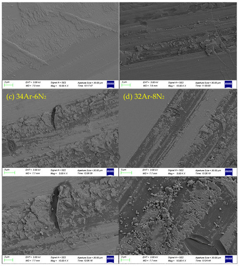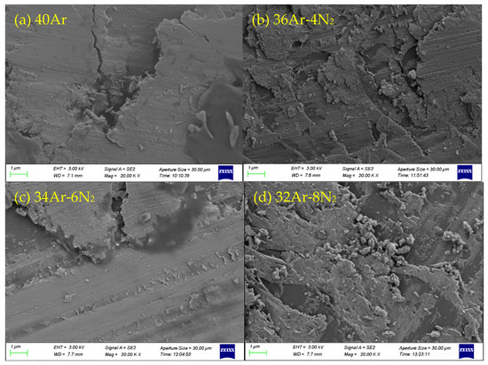 Local amplification of the wear track (magnification 20 K). The wear debris morphology in the wear track is shown in Figure 9. It can be seen that the wear debris of the coating samples prepared under different sputtering gas conditions is very different. Figure 9a shows that the wear debris is mainly composed of fine columnar particles when the sputtering gas is 40Ar. Figure 9b shows that the wear debris is mainly composed of blocks and flakes when the sputtering gas is 36Ar–4N2. Figure 9c shows that the wear debris is mainly composed of columnar particles and flakes when the sputtering gas is 34Ar–6N2. Figure 9d shows that the wear debris is mainly composed of larger particles when the sputtering gas is 32Ar–8N2.