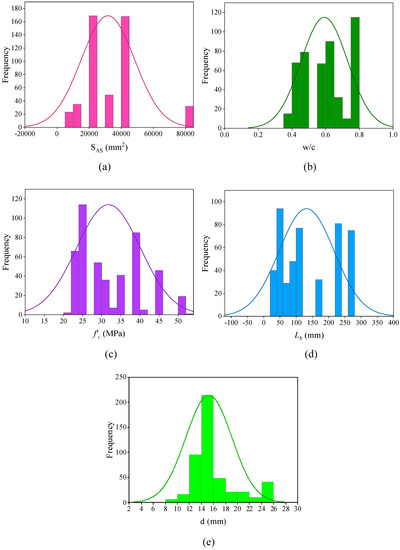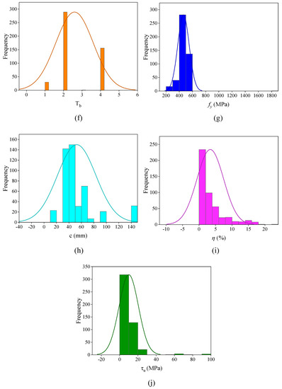Relative frequency distribution of input and output parameters; (a) SAS, (b) w/c, (c) f ’c, (d) Lb, (e) d, (f) Tb, (g) fy, (h) c, (i) η, (j) τu.