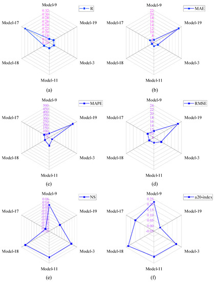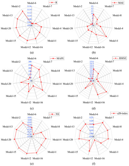 Comparison of performance indices of Group-II models; (a) R, (b) MAE, (c) MAPE, (d) RMSE, (e) NS, (f) a-20 index.