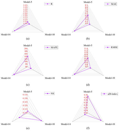 The comparison of performance indices of Group-III models is displayed in Figure 9. In Group-III models, the R-values were between 0.30 and 0.40. Therefore, only three analytical models have fallen into the group. The R-value of Model-14 was 9.37%, and 9.07% higher than Model-5 and Model-10, respectively. The MAE, RMSE, and MAPE values of Model-10 were 4.514 MPa, 9.888 MPa, and 87.517%, respectively. The MAE value of Model-10 was 24.57% and 42.08% lower than Model-5 and Model-14, respectively. Similarly, the RMSE value of Model-10 is 5.21% and 11.17% lower than Model-5 and Model-14, respectively. In addition, the MAPE value of Model-10 was 37.24% and 51.87% lower than Model-5 and Model-14, respectively. The NS value of Model-10 was also greater than other Group-III models. Therefore, based on the analyzed results, it can be summarized that the performance of Model-10 was good compared with other models. The values of all the performance metrics are reported in Table 5.