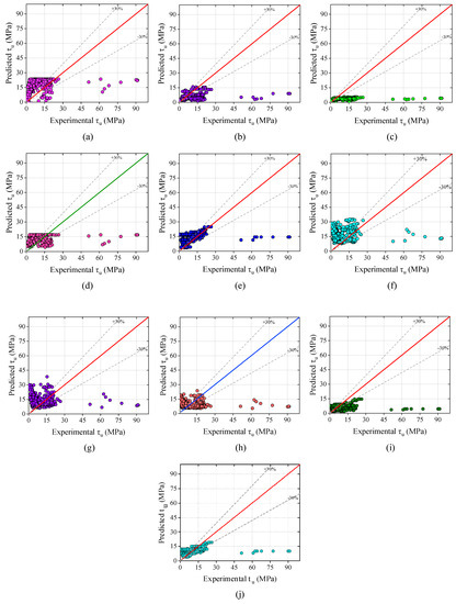 Figure 10 indicates the relationship between experimental and predicted values for each of the analytical models. In all the cases, the scatter plots show the poor performance of all the analytical models.