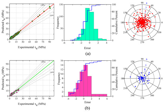 In the development of the ANN model, the dataset was split into three parts, namely training (380 samples), validation (48 samples), and testing (48 samples) datasets. Based on the R and MSE values, thirteen neurons in the hidden layer were selected to build the ANN model. The analyzed results of the ANN model are given in Table 6. The R-values of the training, validation, and testing datasets were 0.994, 0.948, and 0.995, respectively. The overall R-value of the ANN model was 0.99, and the MAE, RMSE, MAPE, NS, and a20-index values of the whole dataset were 1.091 MPa, 1.495 MPa, 17.879%, 0.98, and 0.761, respectively. Figure 11 depicts the scatter plot, frequency distribution, and absolute errors of the developed ANN model. In Figure 11a, the range of the majority of errors (ANN-training) fell between −4 and +4 MPa. The absolute error plot is illustrated on the right side of Figure 11a. The maximum value of the absolute error was 4 MPa. Most of the BS values were within the error range of 2 MPa.