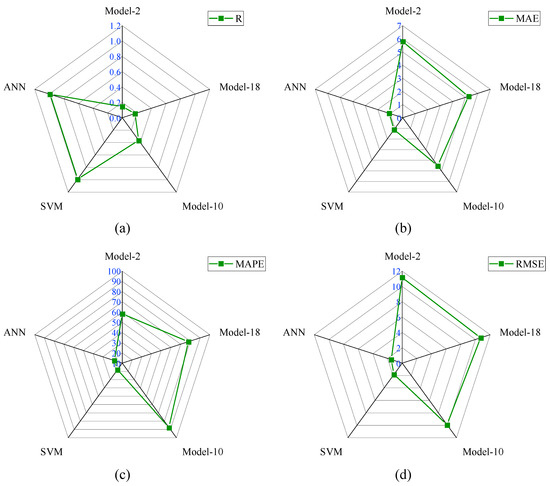 The R-value of Model-2 was 5.8% higher than Model-12, Model-15, and Model-20, sequentially. The MAE value of Model-2 was the lowest among Group-I models. The MAE value of Model-2 was 39.58%, 27.23%, 10.99%, 27.29%, 51.91%, 35.75%, 24.34%, 26.47%, 23.34%, 5.55% lower than Model-6, Model-7, Model-8, Model-4, Model-1, Model-16, Model-12, Model-15, Model-20, and Model-13, respectively. The comparison of the performance indices of Group-II models is demonstrated in Figure 8.