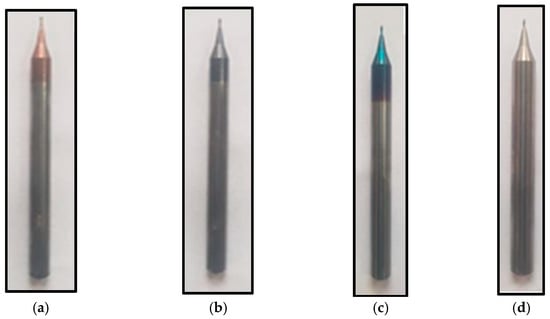 CNC milling machine (PARPAS PHS-680, OMV, PARPAS, Italy) was used to perform micro-milling tests on nickel-based superalloy Inconel 718. Initially, a carbide end mill with a 12 mm diameter was used to level the work piece surface. Afterwards, the surface was employed as a point of reference for the design process. A tool pre-setter was used to ensure accurate z-axis measurements. The experimental parameters are listed in Table 1. Wedge-shaped cutting tools (tungsten carbide steel with 0.06-inch diameter) were used for experimentation. Different cutting tools used in this work are shown in Figure 1. Microtools with nACo, AlTiN, and TiSiN coated cutting edges had an average cutting-edge radius of 1.3 µm, 1.21 µm, and 3.0 µm, respectively.