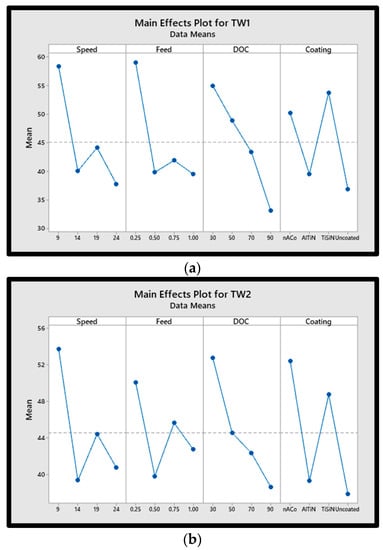 The finished product quality and the accuracy of the machining process are both adversely affected by tool wear [46], which is an irreversible process. The tool wear rate is directly proportional to the high temperature strength of the workpiece material [47,48], among other factors. Main effect plots for tool wear are shown in Figure 3. Here the individual effect of each input parameter is analyzed on tool wear progression. It is observed that all machining parameters including cutting speed, feed rate, DOC, and coatings have significant effects on tool wear. As seen in Figure 3, higher cutting speeds and moderate feed rates can reduce abrasive wear in the beginning. As a result of irreversible wear on tools, higher temperatures in the cutting zone can cause volumetric gain, which can lead to the workpiece material adhering to the tool’s cutting face, reducing the tool’s hardness, and increasing its wear rate. The hardness of the workpiece and the machining parameters used during the machining process affect the effective tool life of a cutting tool. Non-uniform abrasion of the active cutting edge, tool cutting face, and tool flank are responsible for the high tool wear rates.