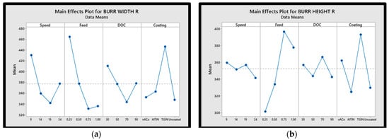 The burr width and burr height for both up milling and down milling were used as response variables in the current research. Main effect plots for burr width and burr height for both up milling and down milling are shown in Figure 5. The results indicated that the down milling operation produced the majority of the burr generated during the experiment. During the burr analysis, researchers focused their attention on the very top burr. Each slot’s maximum burr width and height were determined using a digital microscope.