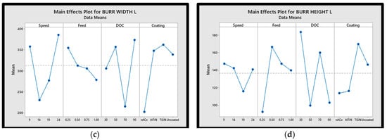Main effects plots of (a) burr formation width down milling, (b) burr formation height down milling, (c) burr formation width up milling, (d) burr formation height up milling.