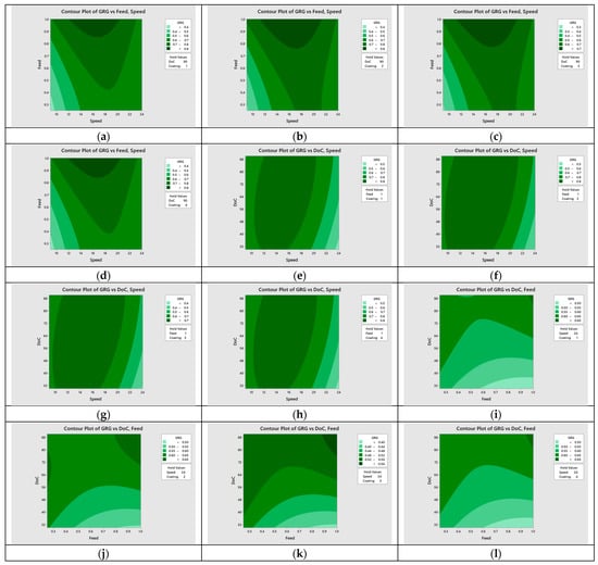 Contour plots of GRG vs. machining parameters (a) speed vs. feed, nACo; (b) speed vs. feed, AlTiN; (c) speed vs. feed, TiSiN; (d) speed vs. feed, uncoated; (e) speed vs. depth of cut, nACo; (f) speed vs. depth of cut, AlTiN; (g) speed vs. depth of cut, TiSiN; (h) speed vs. depth of cut, uncoated; (i) feed vs. depth of cut, nACo; (j) feed vs. depth of cut, AlTiN; (k) feed vs. depth of cut, TiSiN; (l) feed vs. depth of cut, uncoated.