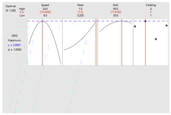 Multi objective functions were made for the four discrete input parameters, i.e., tool coatings, as given by Equations (6)–(9). Since tool coating is a non-continuous categorical factor with four distinct levels: nACo, AlTiN, TiSiN, and uncoated. These four equations are valid for all input parameter values of the ranges selected in this study. Then RSM was used to carry out optimization of the regression models. The surface plots of GRG at various machining parameters are shown in Figure 6. The contour plots of GRG for all four tools are shown in Figure 7 at various machining parameters.