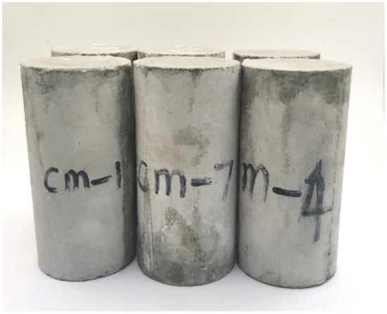 The porous cement mortar was made in a ratio of water: cement: standard sand: kaolin = 2:3:4:1. To increase the porosity of the cement mortar, an air-entraining agent with a mass ratio of 0.78 g per kilogram was added to the mortar slurry. The mixed proportion and the addition of the air-entraining agents had an important influence on the porosity, and the standard sand contributed to the strength of the specimens. After being conserved in a standard curing room at a temperature of 20 ± 5 °C and relative humidity of 95% for 28 days, the specimens were processed into cylinders with a diameter of 50 mm and a height of 100 mm according to the method recommended by the International Society for Rock Mechanics (ISRM), as shown in Figure 1. The specimens were divided into two groups. One group of specimens were used for compression tests, and the other specimens were used for porosity measurement. The basic information of the specimens prepared for compression tests is listed in Table 1. The detailed process of porosity measurement is described as follows. First, the specimens were dried in an oven at a temperature of 105 °C for 48 h and then weighed immediately. Second, the specimens were weighed again immediately after immersed in distilled water under vacuum conditions for another 48 h. Finally, the mass difference of the specimen before and after saturation and the volume of the specimen were used to calculate the porosity. The porosity was determined as: