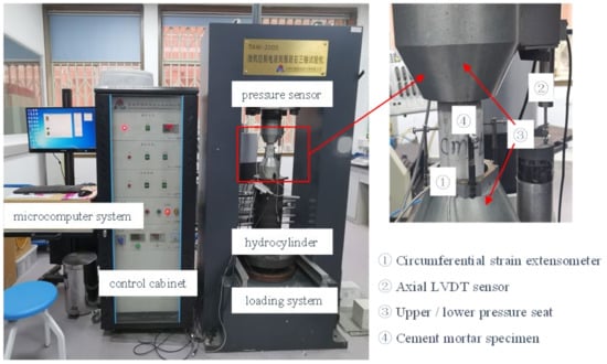 In the past 20 years, studies have been carried out to elucidate the mechanical properties of cement mortar, and several constitutive models of cement mortar have been proposed. Yang et al. [] and Chen et al. [] proposed a constitutive damage model of cement as well as cement-based materials through compressive experiments, including under wet-dry cyclic conditions. Kakavas et al. [] and Chidiac and Mahmoodzadeh [] established constitutive flow models of fresh mortar based on the same assumption that the flow can be represented by three interactions: static interaction, dynamic interaction, and collision. Tan et al. [] researched initial damage and proposed a constitutive model based on the energy theory. Li and Ou [] proposed a constitutive damage model of cement mortar based on three-point bending test results. Zhou and Chen [] conducted Split Hopkinson Pressure Bar (SHPB) tests and proposed a dynamic damage constitutive model of cement mortar. Xie et al. [] concluded that the peak strength increases with the increase in the strain rate in a compressive experiment on cement asphalt mortar. Andronikos et al. [] proposed an electrical method to sense damage to the cement mortar. Zhu et al. [] elucidated the damage evolution and dynamic performance of cement asphalt mortar under dynamic vehicle load and developed a statistical damage constitutive model for numerical simulation. Moreover, Chen et al. [] took a thermodynamic approach to comprehend the elastoplastic behaviors of heat-treated mortar and proposed a constitutive damage model.