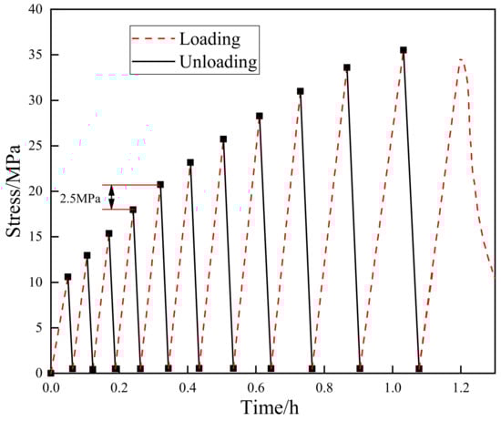 In the present study, two kinds of experiments were conducted: (1) uniaxial monotonic compression tests to determine the basic mechanical properties of the material, and (2) uniaxial cyclic loading-unloading tests to obtain the evolution of irreversible strain. The cyclic loading path was determined based on the following principles: the axial stress should be unloaded to almost zero to obtain irreversible strain, and the loading rate should be small enough to avoid the dynamic effect. As shown in Figure 3, the uniaxial compression tests were conducted in axial deformation control mode at an axial deformation rate of 0.06 mm/min, and the cyclic uniaxial compression tests were conducted at an axial deformation rate of 0.06 mm/min during loading and at an axial stress rate of 0.25 MPa/s during unloading. The detailed loading and unloading process implemented during the cyclic compression tests was as follows: In the first stage, the specimen was loaded to 10.00 MPa at an axial deformation rate of 0.06 mm/min in order to avoid sudden destruction. Then, it was unloaded to 0.50 MPa at an axial stress rate of 0.25 MPa/s in order to obtain accurate unloading stress. In the subsequent loading–unloading cycles, the upper limit of the axial stress was increased by 2.50 MPa each time, whereas the lower limit of unloading was kept invariable. When the specimen was loaded to the peak stress, the axial stress was immediately unloaded to 0.50 MPa, and the specimen was then loaded to failure at an axial deformation rate of 0.06 mm/min. All of the test processes were conducted according to the method recommended by the International Society for Rock Mechanics (ISRM).