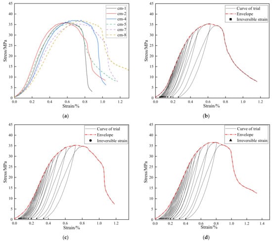 Stress–strain curves of conventional uniaxial compression tests and cyclic loading and unloading tests: (a) all specimens; (b) cm-5; (c) cm-7; and (d) cm-8.