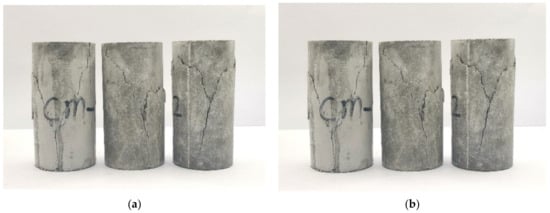 As shown in Figure 5, the failure pattern of cement mortar specimens under uniaxial cyclic loading–unloading is characterized by two intersected shear fracture surfaces, which is similar to that in monotonic compression tests. Different from materials with compact structures, the porous internal structure of the cement mortar allows more amount of shearing dislocation between particles, and the microcracks are prone to expand along the boundary of the aggregates due to the weak bonds between particles, which is quite similar to the failure modes of some porous materials [,].