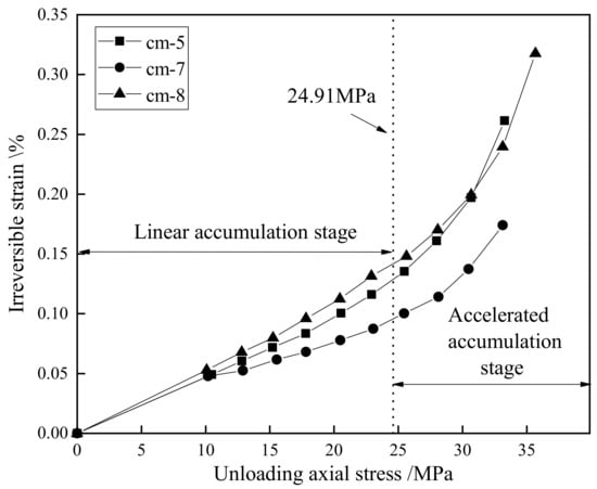 Figure 7 shows the relationship between the irreversible strain at the terminal of unloading and the axial stress from which unloading starts, namely the unloading stress. In the study of porous materials, the irreversible strain increases during the process of cyclic loading and unloading [,]. The accumulated irreversible strain increases as the number of cycles increases, as seen in Table 3. It can also be seen from Figure 7 that there is a positive correlation between the irreversible deformation and the unloading stress. The curves of the accumulated irreversible strain can be divided into two stages, namely, the linear growth stage and the accelerated accumulation stage, respectively.