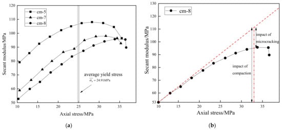 Relationship between secant modulus and axial stress: (a) all specimens of cyclic loading tests; (b) schematic analysis method for compaction and microcracking.