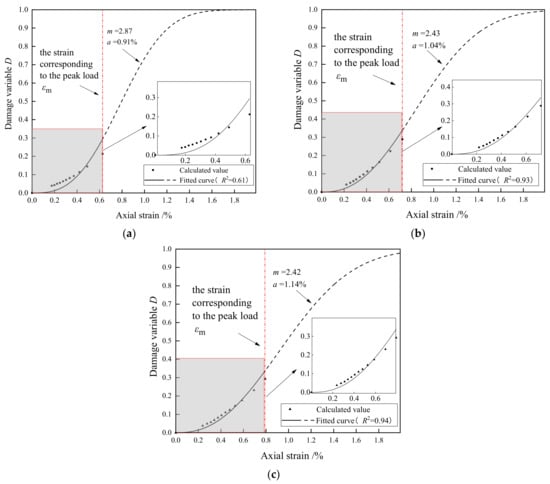 As shown in Figure 9, the mark points are calculated according to Equation (5) and the test results of cyclic compression tests. The curves are fitted according to Equation (6) and the mark points. In the compaction stage, as the axial strain increases, the damage variable increases gradually from 0, and the growth rate is relatively slow. After the compaction stage, the damage variable increases exponentially, and the growth rate continues to increase. When the peak stress is reached, the damage growth rate reaches its maximum value. In the post-peak stage, the curves in Figure 9 show that the damage continues to accumulate, but its growth rate continues to decrease. The final value of the damage variable value converges to 1, indicating that the specimens are completely damaged. The main objective of this study is to reveal the pre-peak damage behavior of porous cement mortar for engineering purposes, something that deserves more attention from engineers than the post-peak damage behavior, so the post-peak damage behavior was not measured in the cyclic tests.