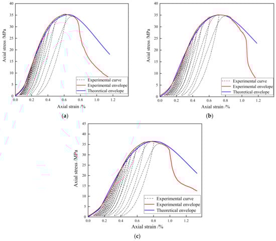 where a and m are the parameters of the Weibull distribution, so they are the same as the parameters in Equation (6). In Equation (6), the parameters are determined by the fitted curves obtained by several damaged variable points, while in Equations (15) and (16), a and m are determined by the boundary conditions of the envelope curves. Both approaches can determine the parameters and result in approximately equal parameters, so parameters a and m in the constitutive damage model in this paper are the average values obtained by these two approaches.