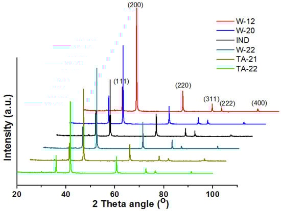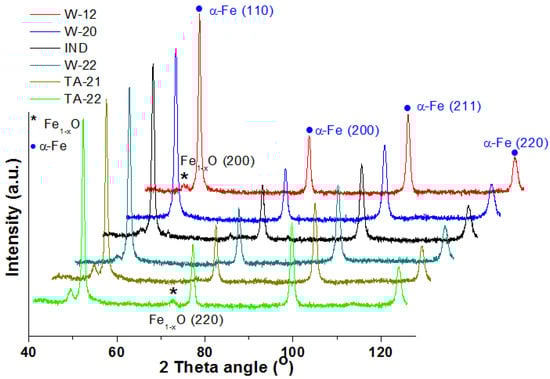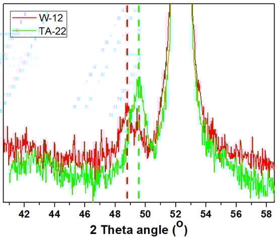 The in situ X-ray diffraction patterns of the catalysts obtained after reduction in a hydrogen atmosphere at 500 °C are shown in Figure 4. At the presented diffractograms, we can distinguish the reflexes originating from four iron crystallographic planes: (110) at 51.9°, (200) at 76.6°, (211) at 98.7°, and (220) at 122.4°. Additionally, in the range between 48 and 50.5°, low-intensity reflexes can be identified. These are attributed to the non-reduced Fe1−xO phase. Their intensity increases with the increasing content of magnesium oxide in the catalyst. When comparing diffractograms, an offset is also observed. The shift of the maximum reflex towards higher angular positions for the TA-22 catalyst with the MgO content is about 0.2° in relation to the W-12 catalyst without oxide magnesium (Figure 5). It can, therefore, be concluded that this reflex corresponds to the phase constituting the solid solution of MgFe1−xO. Taking into account the size of the Mg2+ (0.57 Å) ions in relation to the Fe2+ (0.61 Å) ions, we can explain the observed shift. All diffractograms were made under the same conditions. The average sizes of the iron crystallites calculated on the basis of the diffraction data are presented in Figure 6. A substantial increase in this parameter is observed with an increase in the concentration of magnesium oxide in the precursors.