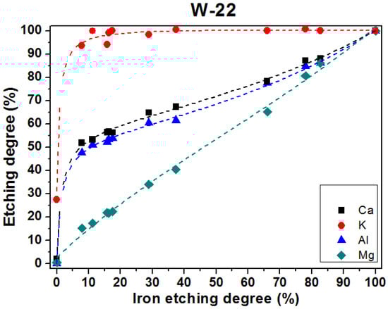 The distributions of the promotors in the precursors were determined with the selective etching method using hydrochloric acid []. The relationship between the degree of promotor etching and the degree of iron etching evaluated in the precursor W-22 is presented in Figure 2. Results for other precursors are shown in Figures S1–S5 in the supplementary data. The degree of etching observed for magnesium is almost identical to the degree of iron etching. Therefore, it is concluded that magnesium ions are incorporated into the lattice of the wustite phase. Analysis of the corresponding relations for calcium and aluminum ions suggests that about 50% of these elements are incorporated into the lattice of the wustite phase and the other part of them fills the intergranular spaces, supposedly forming the glassy phase. Potassium is located in the intergranular spaces, which is in line with a former report [].